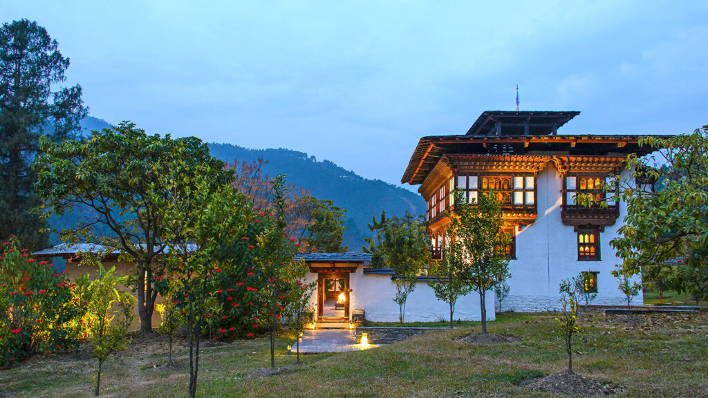 Das Zentrum bildet ein traditionelles, weiß getünchtes bhutanisches Bauernhaus, das elegant restauriert wurde. Es beherbergt den Speisesaal, eine gemütliche Lounge und den Teepavillon mit Blick auf den Orangenhain.