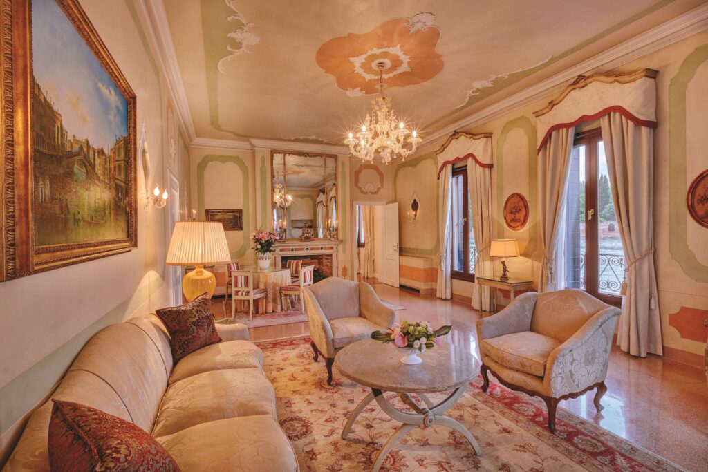 Zimmer, Junior Suiten und große Suiten mit Blick in Gärten oder über die Lagune. Französische Fenster, feine Stoffe und Muranoglas formen ruhige Räume. Bäder aus Stein werden zu Inseln der Entspannung, einige Kategorien bieten Salon und Terrasse.