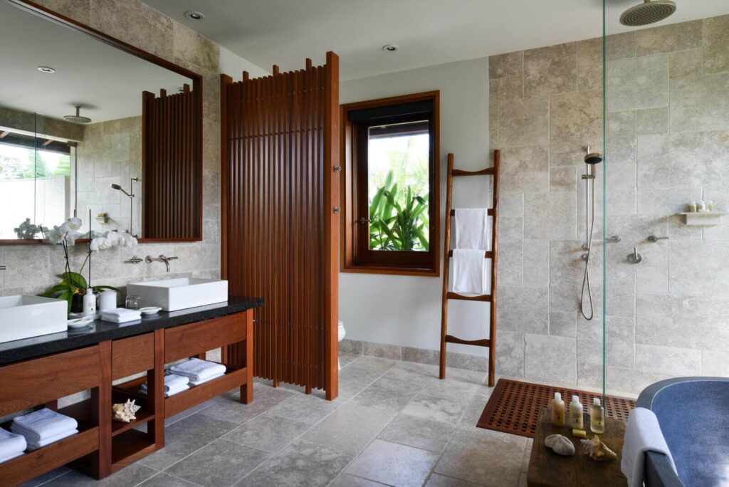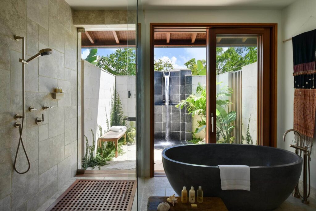 Klimaanlage, Private Veranda oder Sonnenterrasse, Direktwahltelefon mit Anrufbeantworter, Satellitenfernseher, Flachbildfernseher, DVD-Player, Elektronischer Safe, Tee- und Kaffeezubehör, Badewanne und Dusche, Eigene Bar, Pflegeprodukte von COMO Shambhala, Bademäntel, Haartrockner, Dusche, Separate Badewanne