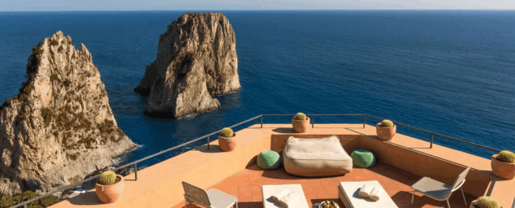 Das Punta Tragara hat einen klassischen und raffinierten Stil für diejenigen, die eine Mischung aus antikem Chic und zeitgenössischer Kunst suchen, dessen höchster Luxus die natürliche Umgebung von Capri ist. 1920 wählte der lombardische Ingenieur Emilio Errico Vismara die Punta Tragara als den Ort für den Bau seiner Villa: steil über dem Meer und mit Blick auf die Faraglioni. Unterstützt wurde er in sein Vorhaben von Le Corbusier, der das Haus als “eine Art architektonischer Blüte, etwas gleichsam aus dem Felsen Ausströmendes, als Abkomme der Insel und pflanzliches Phänomen” bezeichnete.