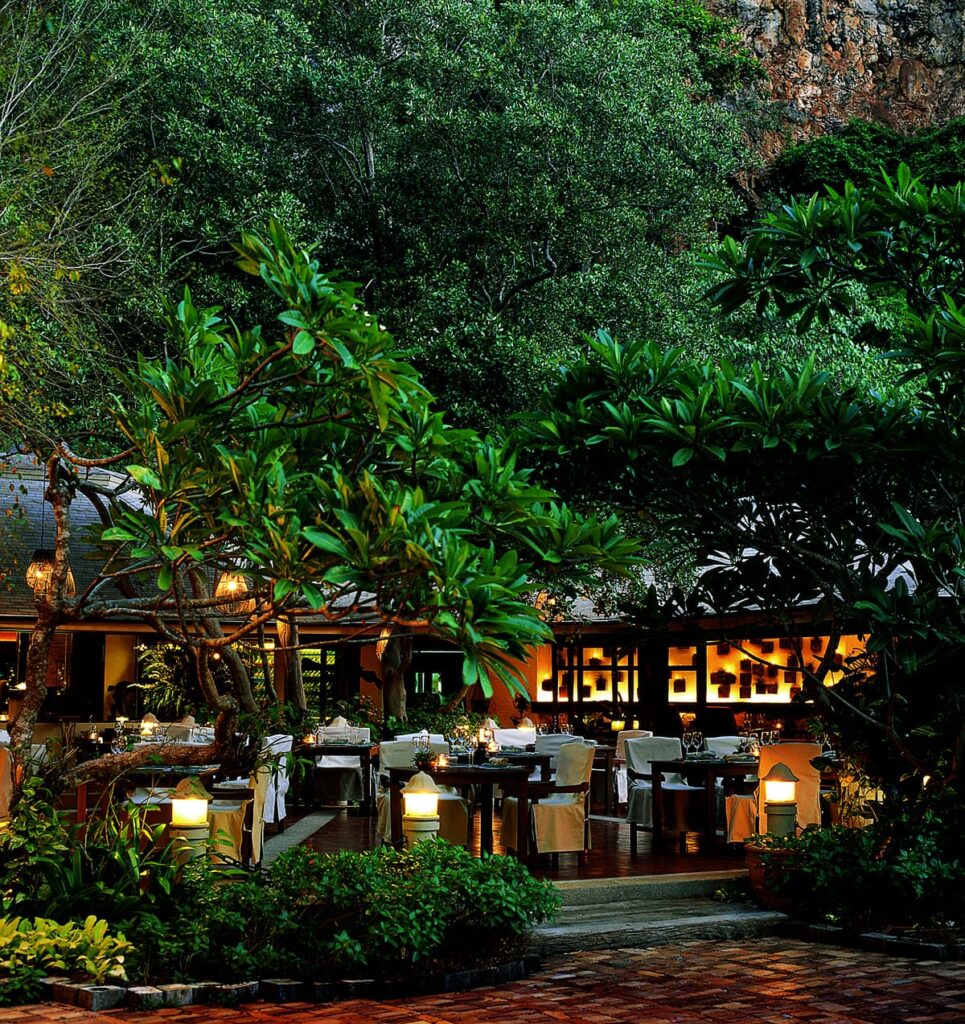 Restaurant “Raya Dining” mit internationalen Spezialitäten “à la carte” oder vom Buffet, Strandrestaurant “Krua Pranang” mit thailändische Spezialitäten, “Raitalay Terrace” am Pool und “The Grotto” (in einer Grotte gelegen), Bar, Lesezimmer