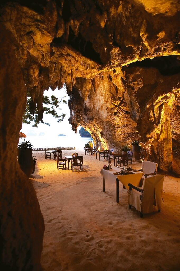An einer nur vom Meer zugänglichen Landzunge auf dem Festland von Krabi liegt das zu den “The Leading Hotels of the World” gehörende Luxusresort Rayavadee. Bereits bei der Ankunft, wenn man das Boot verlässt und die Füße den reinen weißen Sand berühren, ist die alltägliche Welt ganz weit, weit weg! Das luxuriöse Resort Rayavadee scheint von der Natur selbst genau für diesen Zweck, einfach mal loszulassen und sich selbst zu finden, erschaffen worden zu sein. Umgeben von gewaltigen Kalksteinklippen, versteckt unter riesigen Palmen befindet sich im Marine National Park dieses Hideaway. Das Hotel liegt gleich an drei wunderschönen Sandstränden, von denen zwei für die öffentliche Nutzung geeignet sind. Im Rayavadee kann man allen erdenklichen Komfort und Luxus genießen. Die wunderschön ausgestatteten Pavillons sind integraler Bestandteil des Resorts und fügen sich nahtlos in die spektakuläre Landschaft ein. Alle Pavillons sind außergewöhnlich großzügig gestaltet und komfortabel eingerichtet. Einige Villen besitzen sogar einen eigenen Swimmingpool mit Jacuzzi, ein privates Esszimmer mit Butler-Service und vielerlei anderer luxuriöser Annehmlichkeiten. Neben dem beherrschenden Element Wasser, bietet das Resort auch ein außergewöhnliches Spa mit großem Wellnessangebot. Empfehlenswert ist zum Beispiel eine einstündige Thai Boran Massage mit anschließendem Thai Herbal Wrap. Rayavadee – ein paradiesischer Zufluchts ort vor der alltäglichen Welt. Tipp Beschließen Sie den Tag mit einem spektakulären Dinner in einer Grotte mit Blick auf das türkisblaue, glitzernde Meer!
